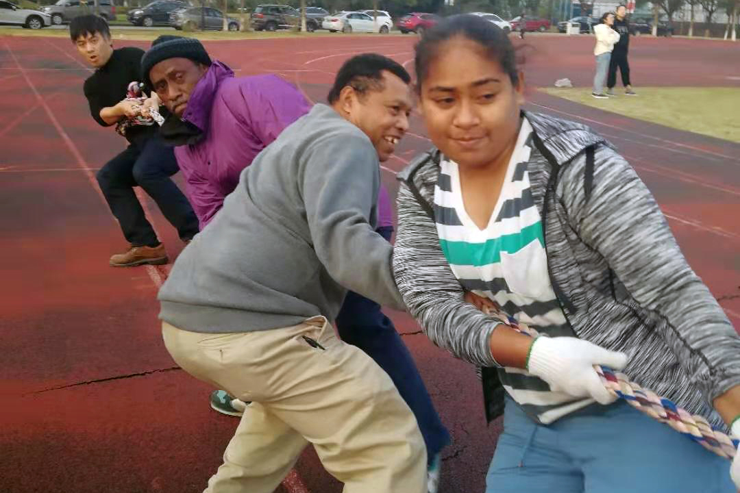 为了能让巴新教师尽快融入中国的生活环境,航海工程学院选派徐超老师专门负责他们的日常生活,并为他们开设中文课。目前,三名巴新教师非常适应在我校的生活,他们不仅能自己坐公交车逛街购物,还能在寝室厨房包饺子。他们体验到了中国经济的蓬勃发展所带来的各项生活便利。在上周举行的我校第十四届教职工运动会中,巴新教师积极参与,为航海工程学院的各项比赛成绩锦上添花。巴新教师Brian说:“感谢你们安排我们参加运动会,让我们有如此美妙的经历,尤其是拔河项目,太棒了,了不起!”