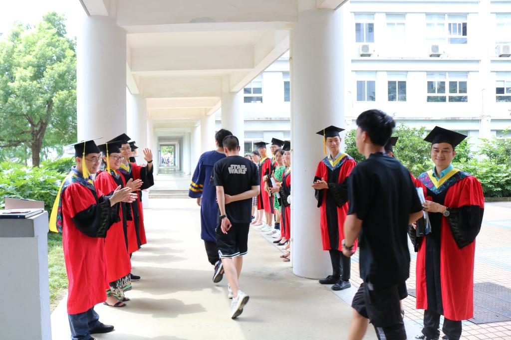 老师们列队欢送毕业生,祝贺大家即将从大学生活的终点迈向社会人生的起点。