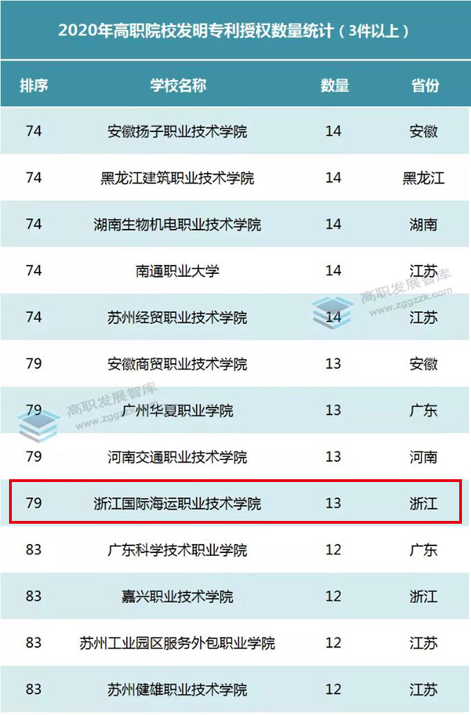 近日,舟山市财政局、舟山市市场监督管理局下达的2021年知识产权专项资金数据显示,2020年我校授权发明专利13项、授权实用新型专利51项,获财政专项资金补助10.2万元,位居全市高职院校(研究院所)前列。根据高职发展智库官网显示,我校2020年获发明专利授权数量排名全国高职院校第79位。