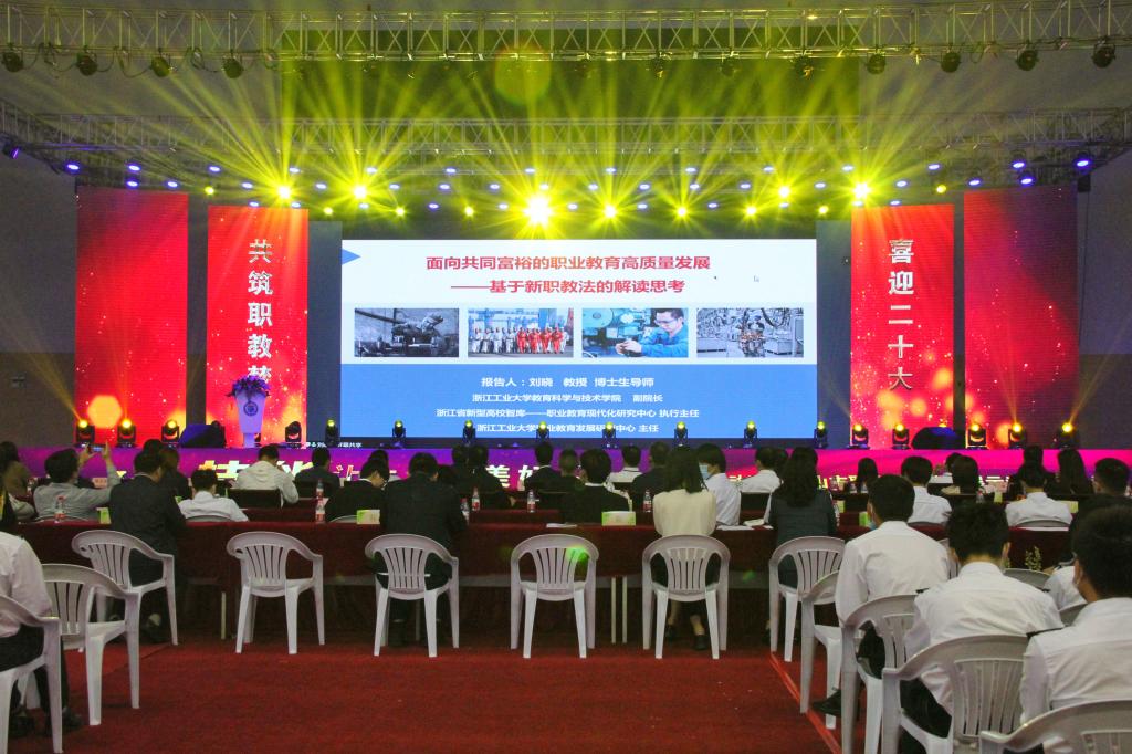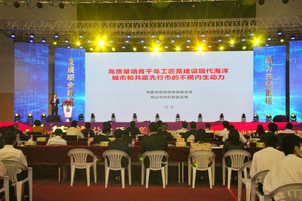 仪式后,还以线上线下相结合的方式举办了两场以共同富裕为主题的学术论坛。浙江工业大学教授、博士生导师刘晓通过线上作了题为《面向共同富裕的职业教育高质量发展——基于新职教法的解读思考》的主旨报告;中共舟山市委市政府政策研究室副主任、舟山市社科联副主席何军现场作了题为《高质量培育“千岛工匠”是建设现代海洋城市和共富先行区的不竭内生动力》的主旨报告。