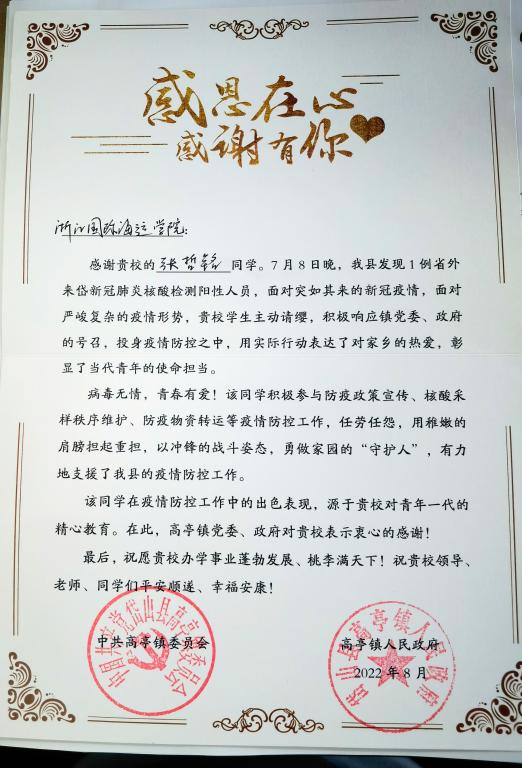 近日,海洋装备工程学院收到了一封来自舟山市岱山县高亭镇人民政府的感谢信,信中对学院2021级港口机械与智能控制2班张哲铭同学在今年7月8日岱山抗击新冠疫情期间,主动请缨、不惧危难、迎难而上的担当行为表示感谢。