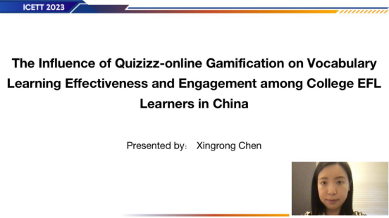 4月21日-4月23日,第九届国际教育与培训技术会议(ICETT)在中国澳门召开。我校国际教育学院陈星蓉老师的论文 《The Influence of Quizizz-online Gamification on Vocabulary Learning Effectiveness and Engagement among College EFL Learners in China》顺利通过会议组委会基于原创性、学术贡献、会议相关性等双盲评审与专业评审。陈星蓉老师受邀参加了本次线上会议,并在会议上作了汇报,介绍了游戏化教学程序Quizizz如何影响中国大学英语学习者的词汇学习效率和学习参与度。该论文在会后被收录至ACM在线数据库,提交 EI Compendex 和 Scopus 等检索。