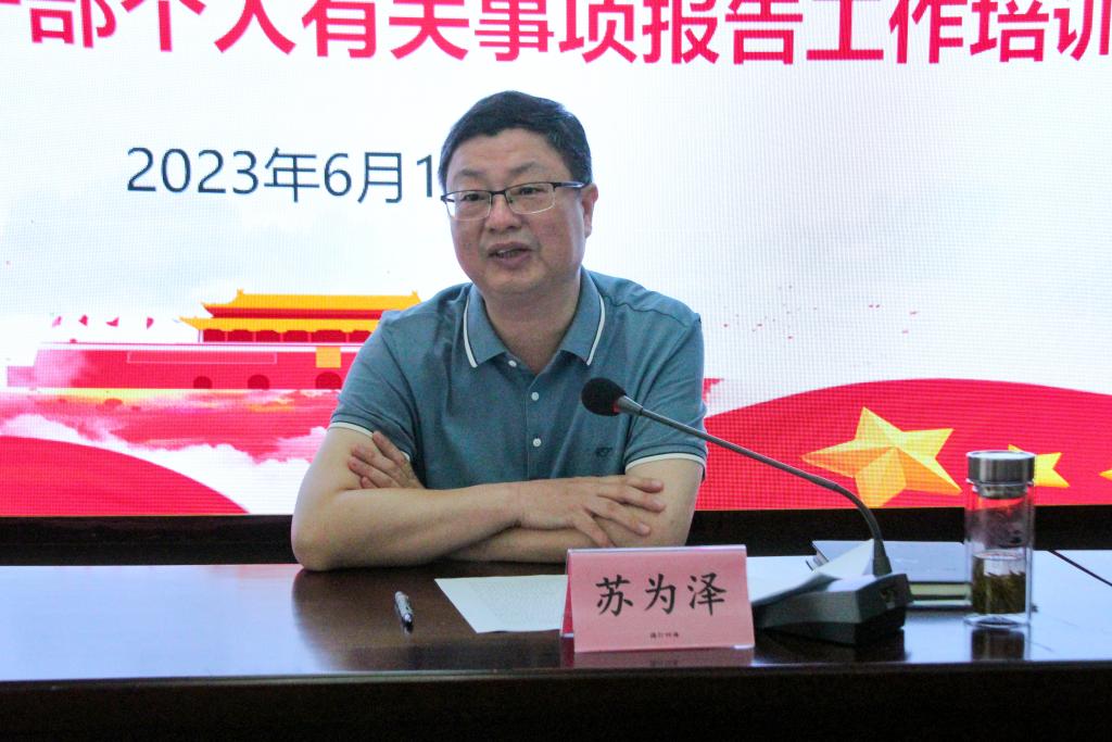 6月16日下午,学校在行政楼401会议室召开2023年学校领导干部报告个人有关事项工作培训会,校党委书记苏为泽出席会议并讲话,校党委副书记孔志光、全体中层干部参加会议。会议由校党委委员、组织部部长黄承主持。