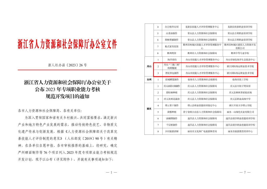 近日,浙江省人力资源和社会保障厅办公室公布了2023年专项职业能力考核规范开发项目。我校朱惠君老师的《舟山“三抱三矾”海鲜腌制专项职业能力考核规范》和郑堃老师的《普陀香包制作专项职业能力考核规范》两项专项职业能力考核规范成功入选。