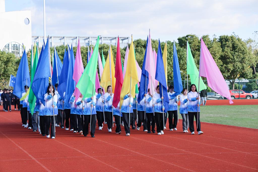伴随着运动员进行曲,英姿飒爽的国旗护卫队、团学干部组成的彩旗队、裁判员方阵迈着整齐的步伐入场。