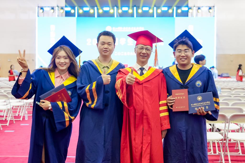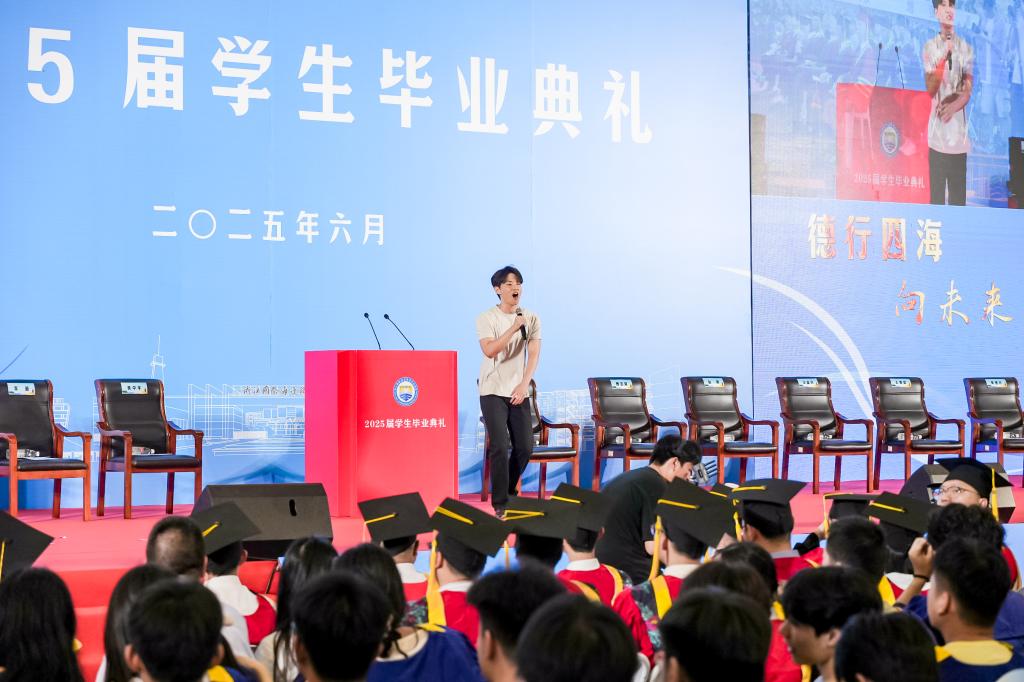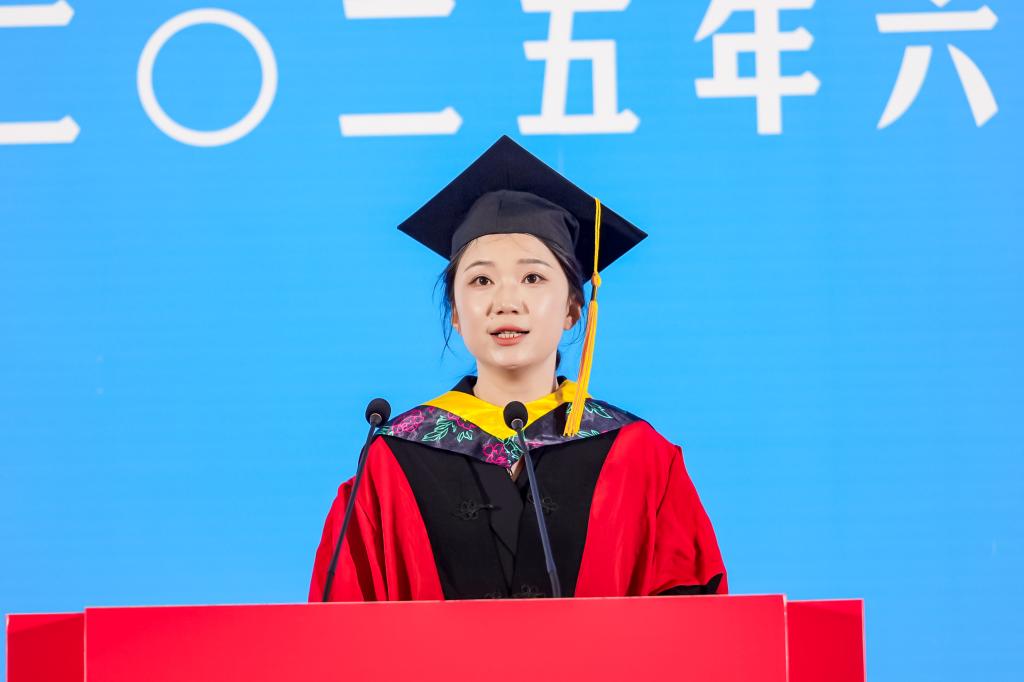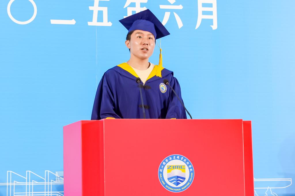 毕业生代表、国家奖学金获得者、舟山群岛新区学生联合会主席、现代港口贸易学院数字媒体艺术设计专业1班的高翔同学发言。他深情回顾了感恩师长培育的心路历程,表示将铭记老师嘱托与母校期许,怀揣真诚与热血步入社会,以不懈努力书写人生的无限可能。