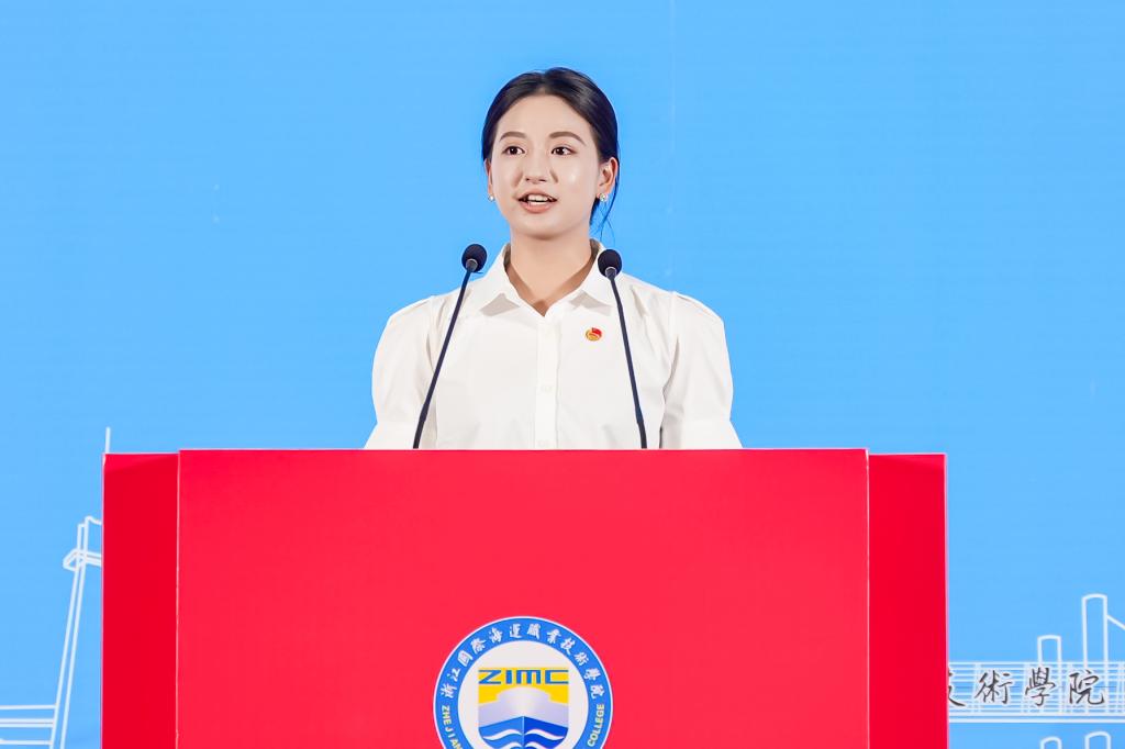 在校生代表、舟山市舟山二十景文旅宣推官、国际教育学院学生会主席、2023应用英语2班的林伊涵同学,深情回顾了学长学姐们在图书馆潜心钻研、在技能赛场沉着拼搏、在志愿服务中守护校园的动人场景,展现了他们可贵的职业精神。她代表全体在校生承诺,必将传承这份光与热,续写母校荣光。