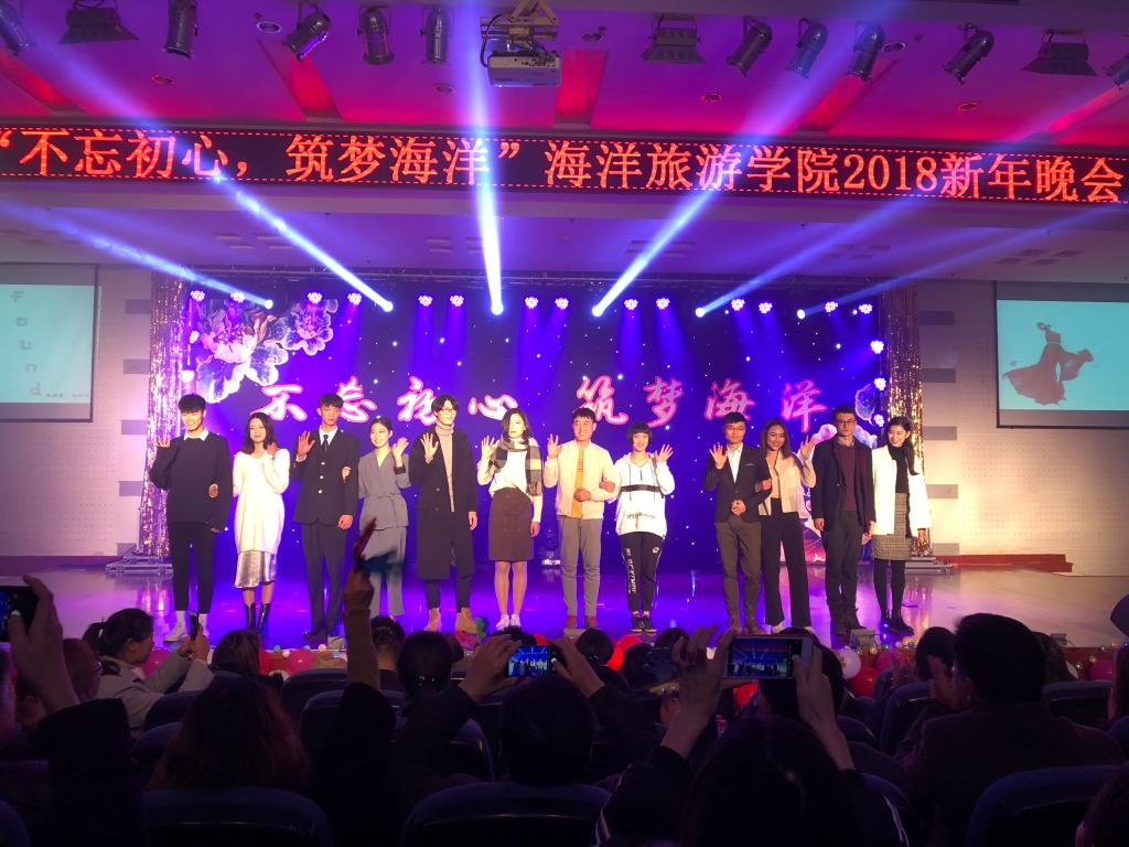 1月3日晚,海洋旅游学院在图书馆报告厅举行了“不忘初心、筑梦海洋”2018新年晚会,校党委副书记胡国光、学院全体教职工和近五百名学生共同观看了演出。