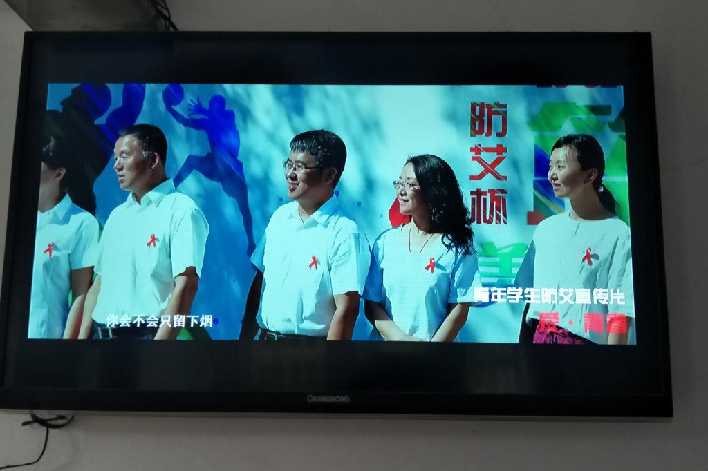 图为学生寝室通过电视播放防艾滋病宣传视频