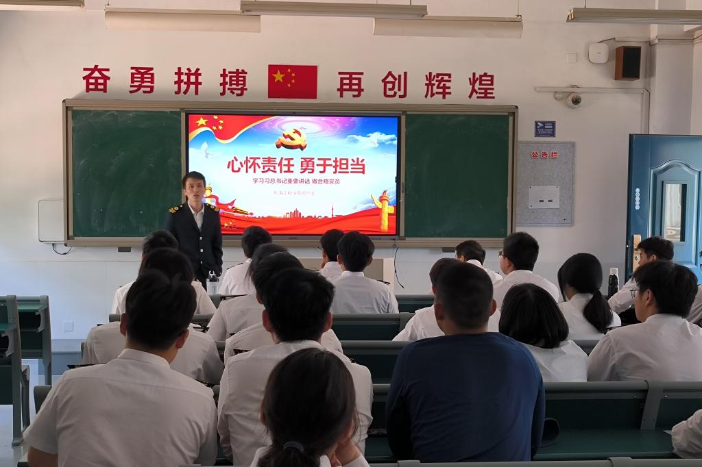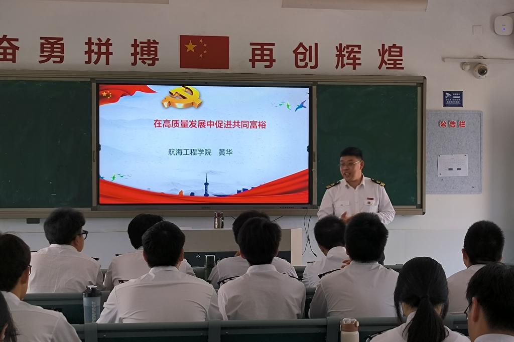 航海党支部书记彭晓星、轮机党支部书记黄华分别给同学们带来了题为《自强自立 不断超越自我》、《在高质量发展中促进共同富裕》的党课,嘱托同学们听党话、跟党走,怀抱梦想又脚踏实地,敢想敢为又善作善为,为中华民族伟大复兴贡献自己的青春力量。