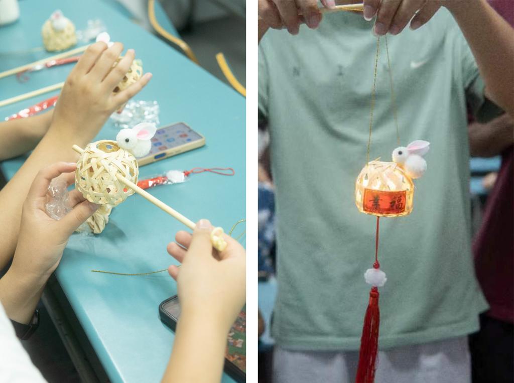 在拿到兔子灯的材料包之后,同学们就迫不及待地开始了制作,他们充分发挥自身的动手能力,绑线、穿洞、放灯、贴字,不一会儿,一盏盏兔子灯就制作完成了。同学们高高兴兴地拎着会发光的兔子灯互相展示。