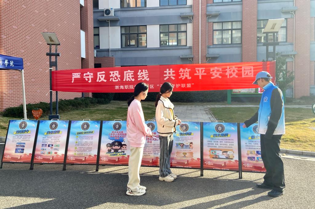 为做好反恐宣传教育工作,提升广大师生员工特别是大学生群体识恐、防恐、反恐的意识和能力,12月14日,浙海职院“平安守护联盟”社团联合岱山县公安反恐怖大队举行了校园反恐宣传活动。
