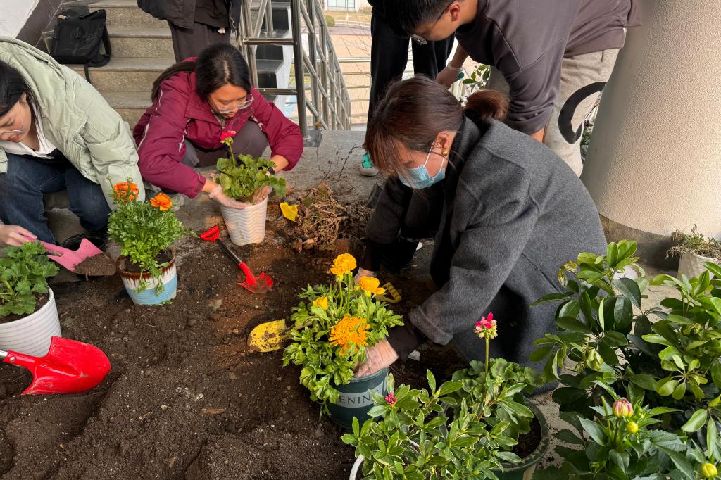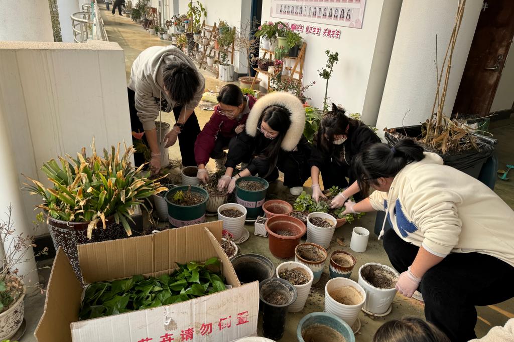 活动中,师生齐上阵,大家干劲十足、分工明确、合作默契,有的搬运绿植花卉,有的持铲挖土,有的扶苗填坑,新种下的一株株美丽花草迎风挺立,展现出勃勃生机,在大家的共同努力下,走廊焕发了新光彩,传递出春的生机与活力。