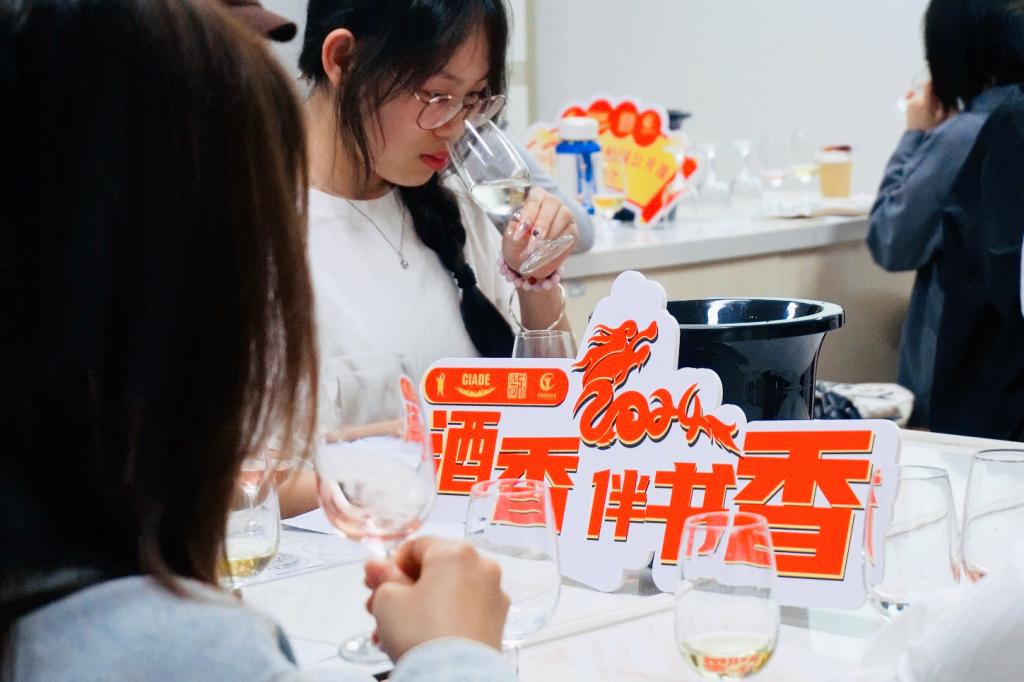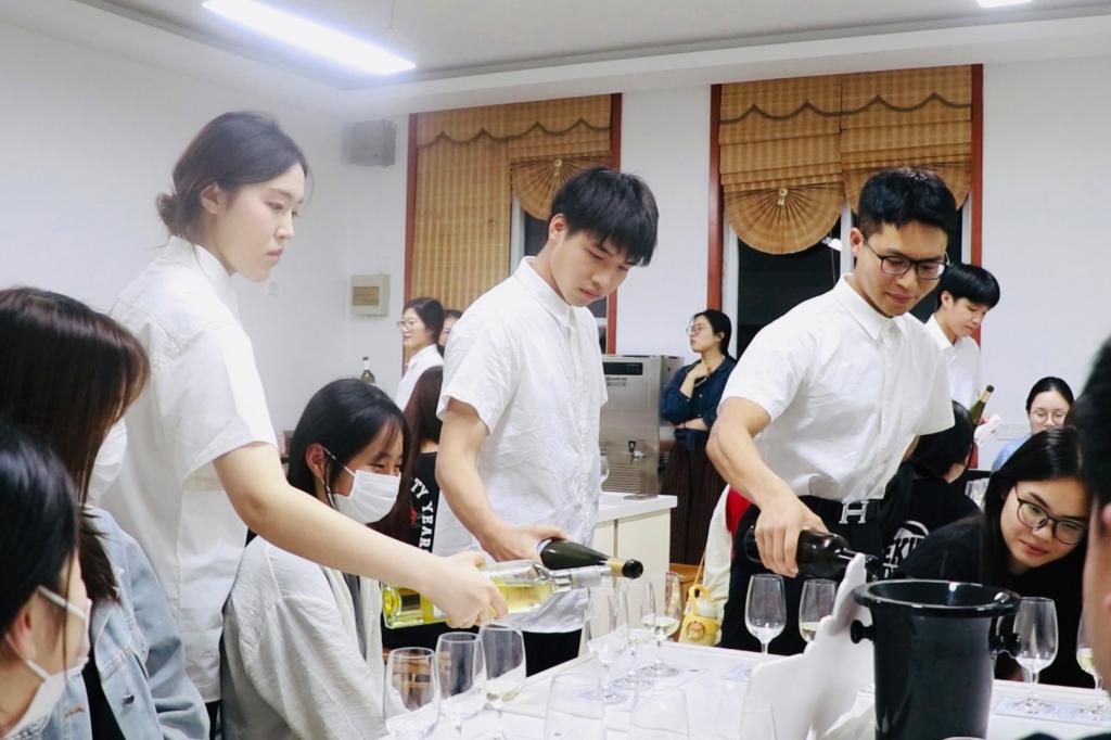 “海上侍酒师俱乐部”社团指导教师孔洁策划组织了学院的40名师生共同参与此次课程。现场,师生们一一品鉴了6款来自京津冀产区的白葡萄酒和桃红葡萄酒,并对葡萄酒品鉴知识和酒款特色进行了介绍。本次品鉴的酒款有的咸鲜味明显,有的花香果香奔放,有的带有独特的龙眼香和玫瑰花香。来自社团的5名侍酒师学生在孔洁老师的指导下全程做好侍酒服务工作,参与活动的学生表示这样的“第二课堂”很不一样,希望以后能推出更多类似的活动。