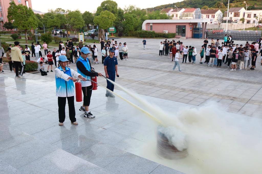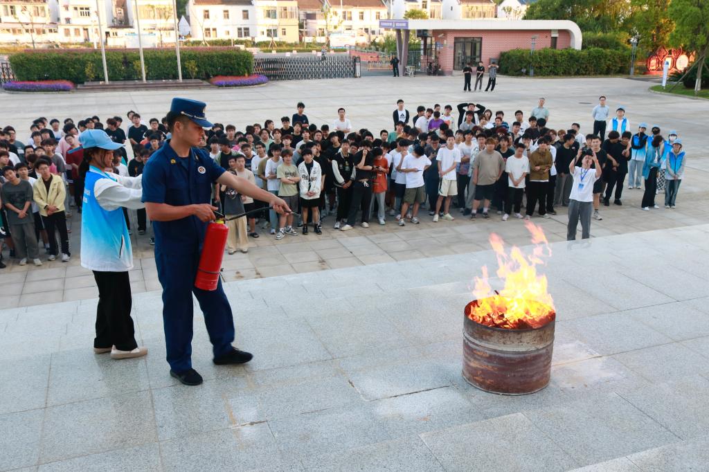 疏散演练过后,岱山消防救援队的消防员向学生们讲解了灭火器的分类、使用要点以及注意事项,详细地指导大家如何正确使用灭火器,并邀请学生体验了灭火器的使用。最后,学院党总支书记童华年对活动的成功举办给予充分肯定,并呼吁广大师生要以此演练为契机,进一步注重消防知识的学习,切实提高火灾应急处置能力。