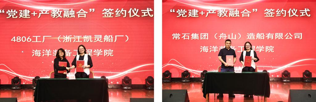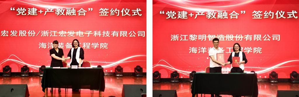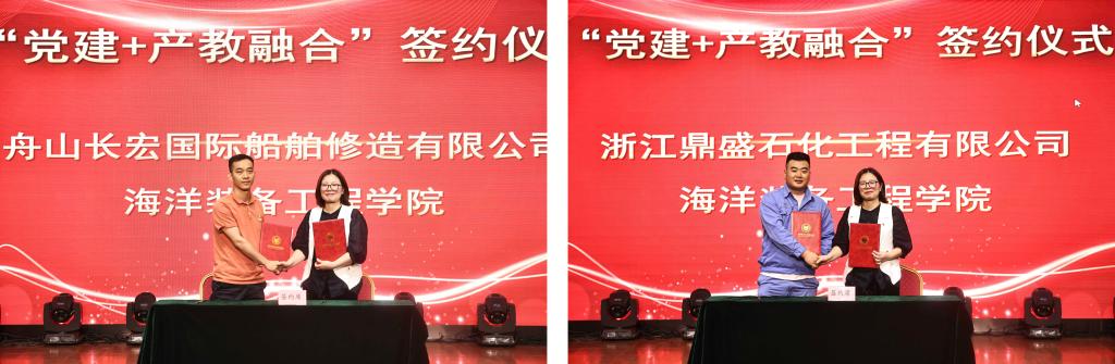 海洋装备工程学院党总支书记罗秀峰代表学院分别与宏发股份/浙江宏发电子科技有限与的公司副总经理史艳,浙江黎明智造股份有限公司人事行政总监胡安庆、4806工厂(浙江凯灵船厂)机关二党支部书记、人事企管处的副处长夏永琴、常石集团(舟山)造船有限公司人力资源部部长张行平、长宏国际船舶修造有限公司综合管理部部长余明,浙江鼎盛石化工程有限公司招聘负责人刘谢飞等企业代表签订产教融合协同育人协议书。