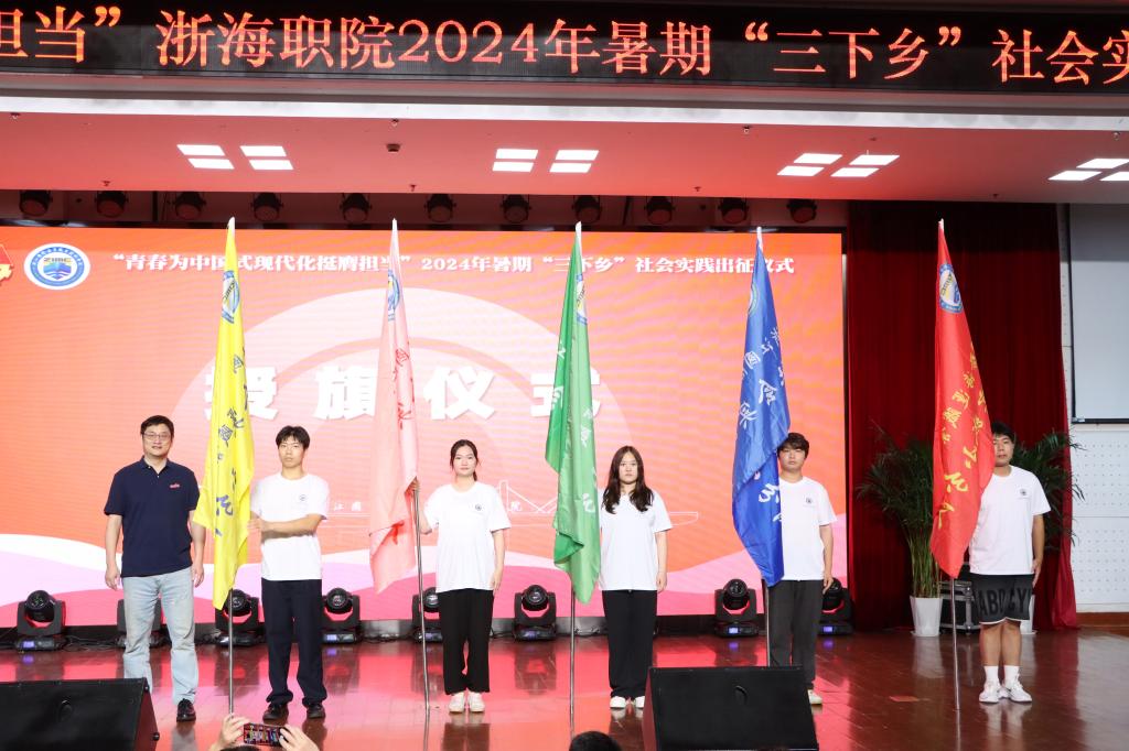 各二级学院党总支副书记为暑期社会实践团队授旗,各二级学院学生代表共同挥舞旗帜,飘扬的旗帜象征着青春的风采。