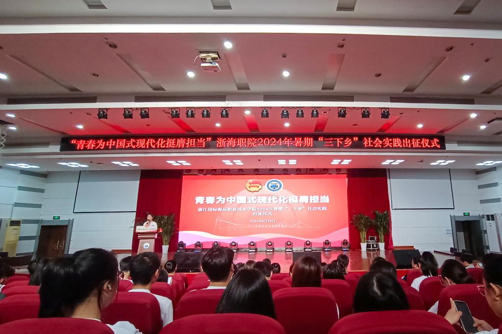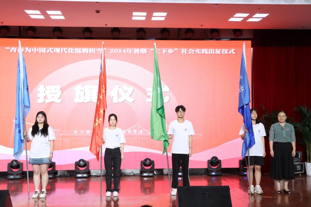 出征仪式在庄严的国歌中拉开帷幕。余娜娜介绍了今年暑期社会实践活动筹备及进展情况。今年全校共组织动员179名学生、34名指导老师,组建21支暑期社会实践队伍,实践团队将走进小岛、农村、社区,围绕“千万工程”、乡村振兴、红色文化等专题,开展各类公益服务、社会调研和志愿帮扶活动。