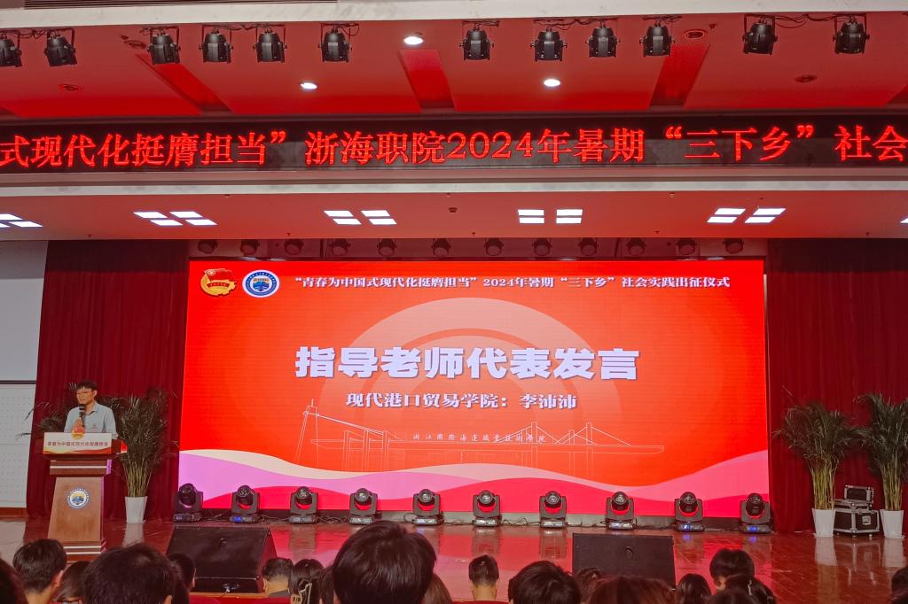 现代港口贸易学院李沛沛作为暑期社会实践指导教师代表发言,表达了要在实践过程中奉献智慧、贡献力量,展现海运新青年的责任与担当。