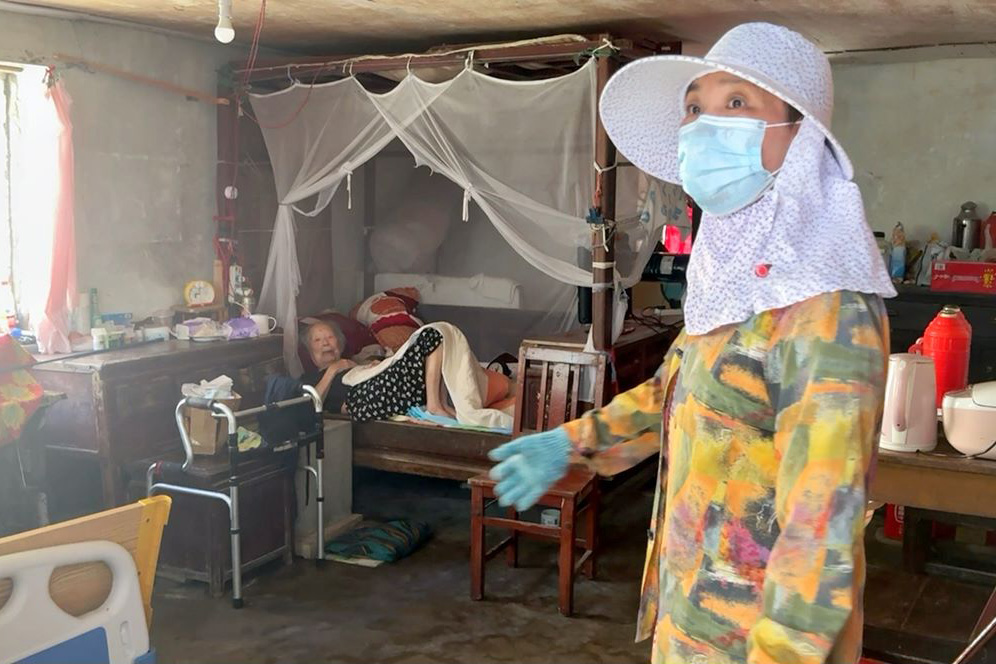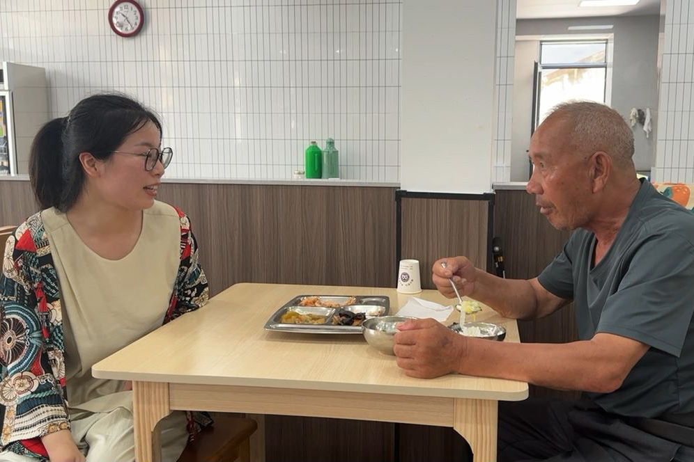 送餐过程中,遇到躺卧在床、身体不适的老人,工作人员会轻轻地敲响房门,慢慢推开大门,热情地与老人们打个招呼,帮他们打开饭盒,一只手搀扶住老人,再用尽全身力气将老人扶上餐桌。她们会为老人们打开窗户,通风,也会坐下来与老人闲聊上两句,老人也会拿出自己珍藏的零食像分享给小孩一样,分享给工作人员。“以前他们建设蚂蚁岛,现在该我们传承这种精神了”郑静说。