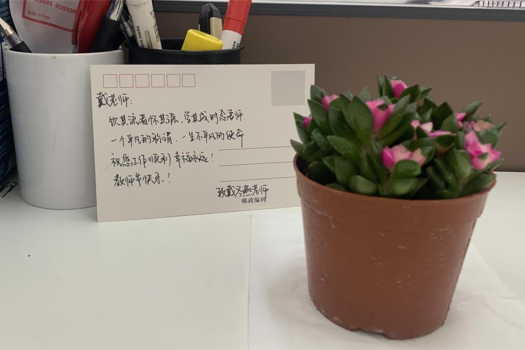 9日上午,石油化工学院学生代表会向教师们送去绿植和同学精心设计的“感谢栽培”贺卡,致以节日的问候。培植要培根,育人要育心。“植绿”与育人有着异曲同工之妙,手捧着造型别致的小小盆栽,看着满载祝福小小卡片,老师们的脸上洋溢着幸福的笑容。