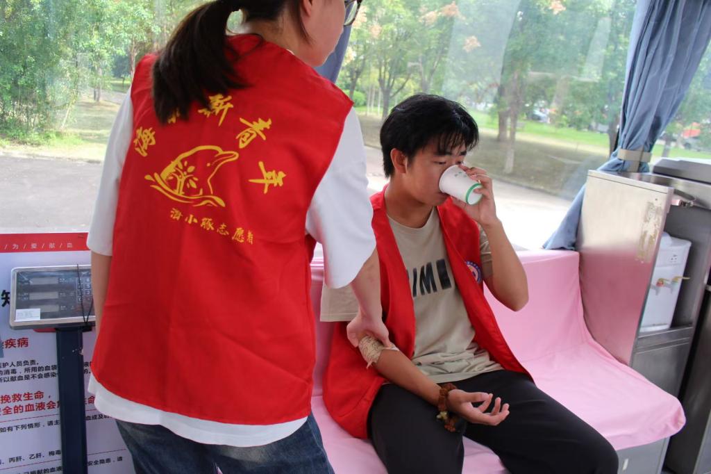 献血完成后,医务人员和志愿者细心地为每位学生贴上止血贴,并提供热水和营养品,帮助他们迅速恢复体力。