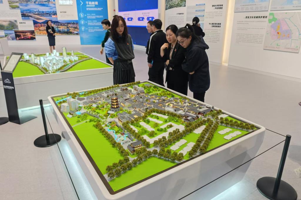 在讲解员的引导下,首先映入眼帘的是运用多种互动体验式科技手段,展示了舟山城市历史变迁、城市规划、城市建设、国家战略、世界一流强港、一岛一功能等内容的数字沙盘,大家身临其境地感受到舟山如何在2万多平方公里蓝色国土上描绘出波澜壮阔的海洋经济版图。通过“千岛探秘”体感游戏、触屏创意互动装置,让大家看到了舟山在海洋经济发展中的创新成果。“海上花园 幸福舟山”展区内,一幅长14.7米、高5.7米的巨型LED长卷,生动展现定海、新城、普陀“三湾两岸”的山海格局、两岸对景、三湾联动的有机生态及世界级活力风情海岸蓝图。