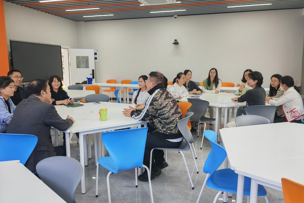 代表团首先观摩了Benjamin外教生动有趣的英语角活动,亲身感受了我校英语学习氛围。随后,在交流会上,双方就大学英语课程分层教学、“1+X”实用英语交际职业技能等级考试、师生竞赛、社会服务、双师型教师成长等话题进行了深入探讨。