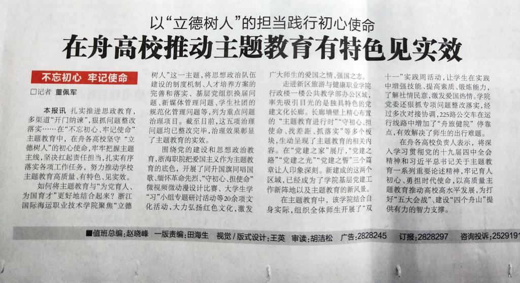 《舟山日报》:在舟高校推动主题教育有特色见实效
