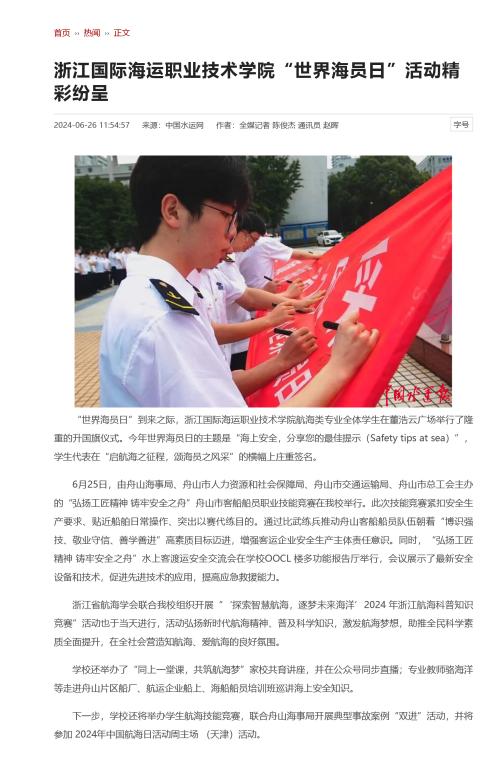 下一步,学校还将举办学生航海技能竞赛,联合舟山海事局开展典型事故案例“双进”活动,并将参加 2024年中国航海日活动周主场(天津)活动。