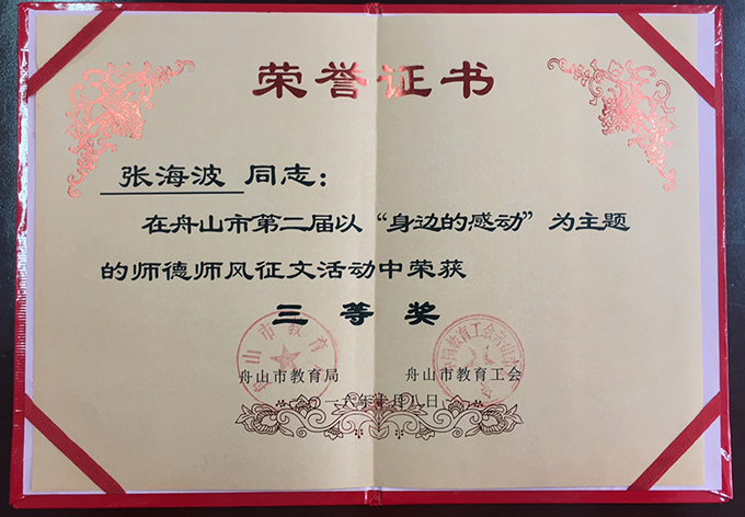 日前,由舟山市教育局、舟山市教育工会主办的舟山市第二届“身边的感动”师德师风征文比赛揭晓,由我校社科体艺部张海波老师执笔、反映沈蕾老师的纪实《一位平凡的体育工作者》在比赛中获得三等奖。